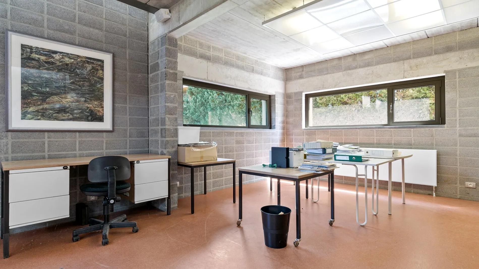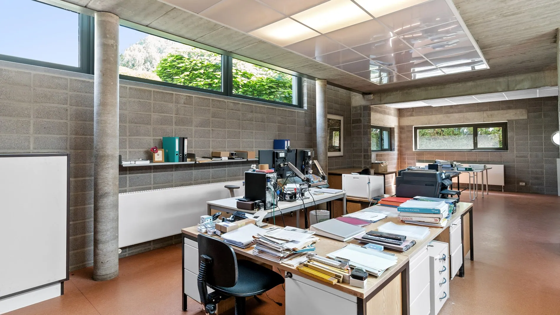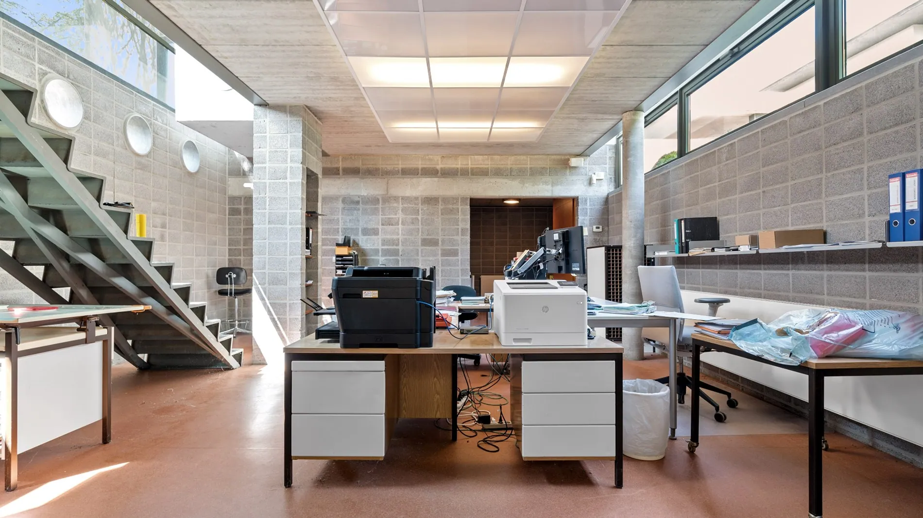 Het benedenverdiep beschikt over een ruime open werkplek met voldoende bergruimte.