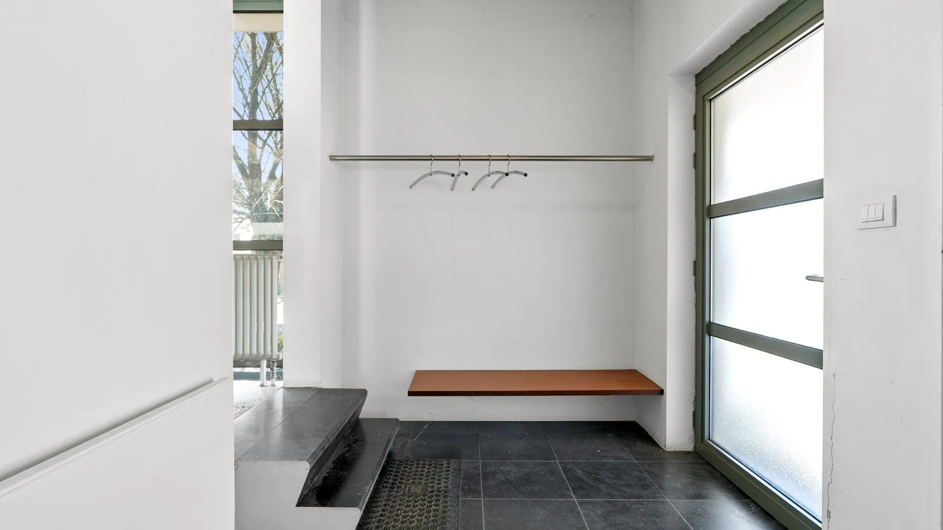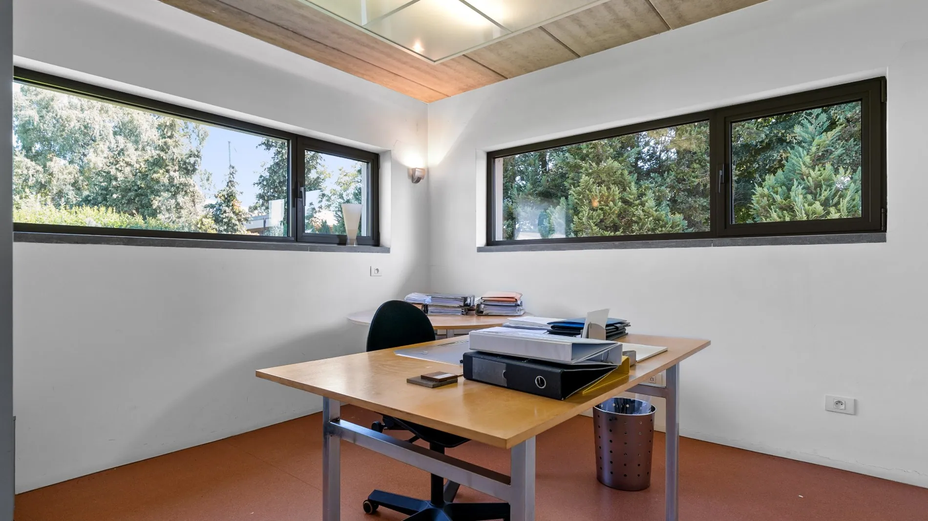 Op het gelijkvloers bevindt zich een uitnodigende ontvangstruimte met een afzonderlijke bureauruimte.