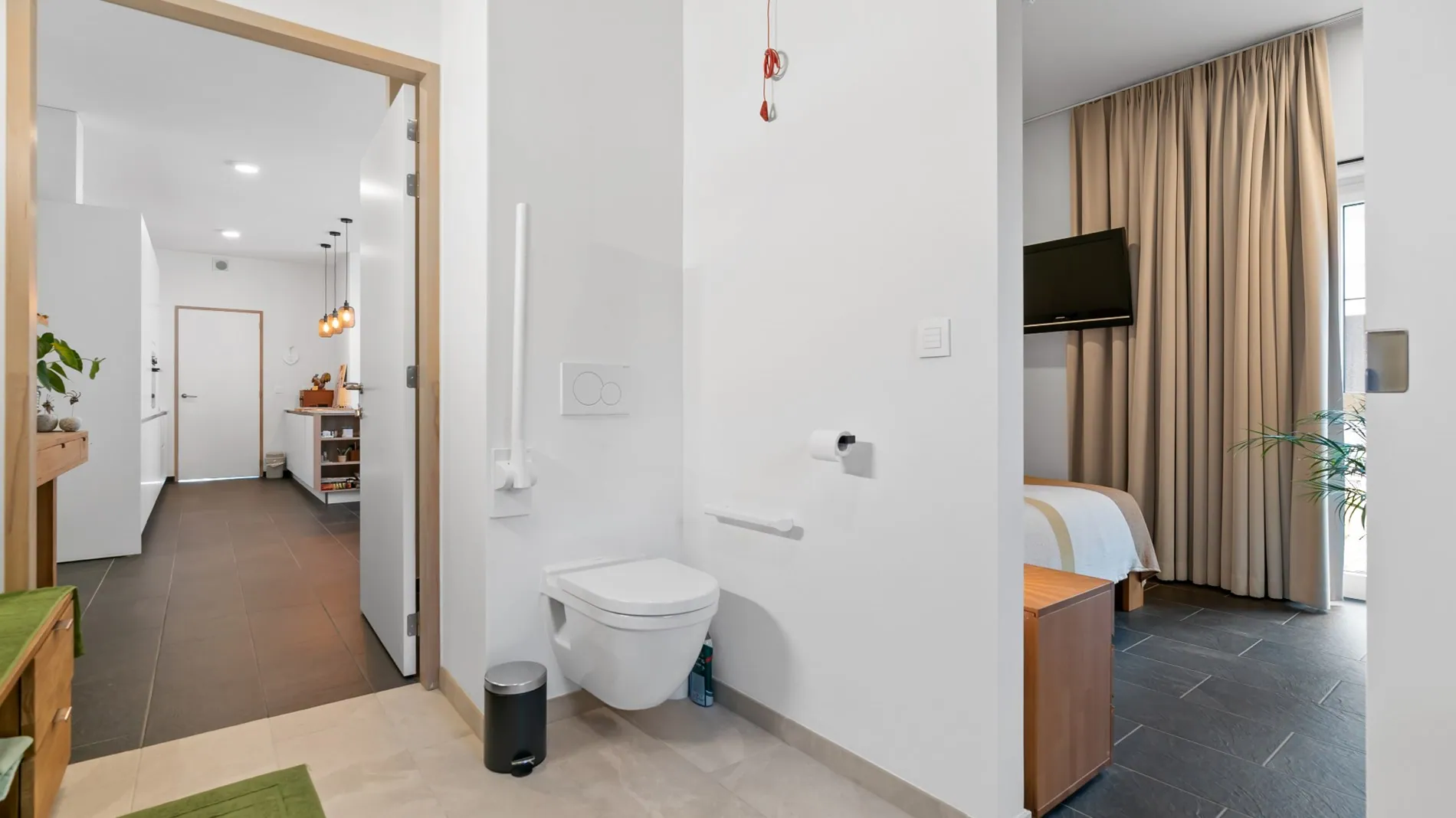 Dit appartement is van het type T2 , is 82 m2 groot en heeft 2 slaapkamers en 1 ruim terras van zomaar eventjes 12 m2 (er zijn zelfs types T2 met terras tot 28 m2). Deze assistentiewoning is ingericht met een badkamer met inloopdouche, een extra gastentoilet, een lichtrijke leef- en eetruimte en een volwaardige compromisloze keuken met kookeiland met 5 hoogwaardige toestellen van Siemens of Miele naargelang uw eis.