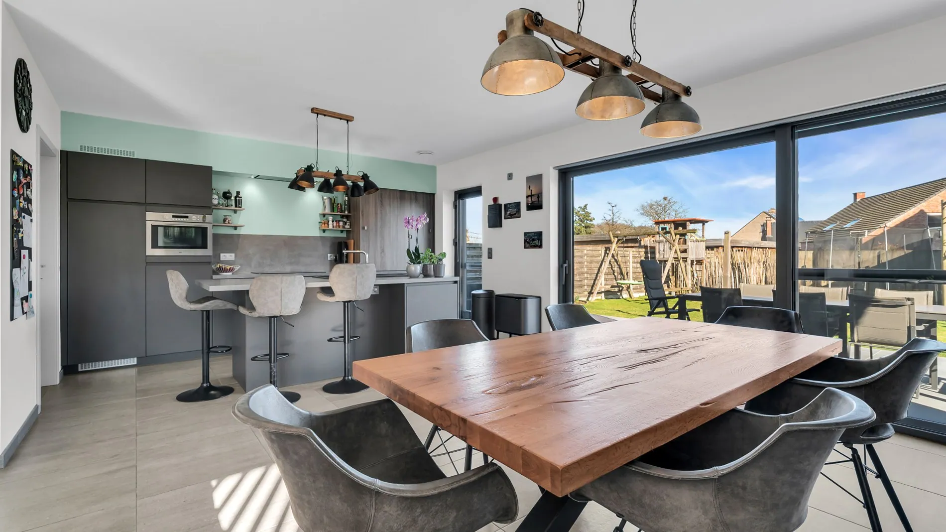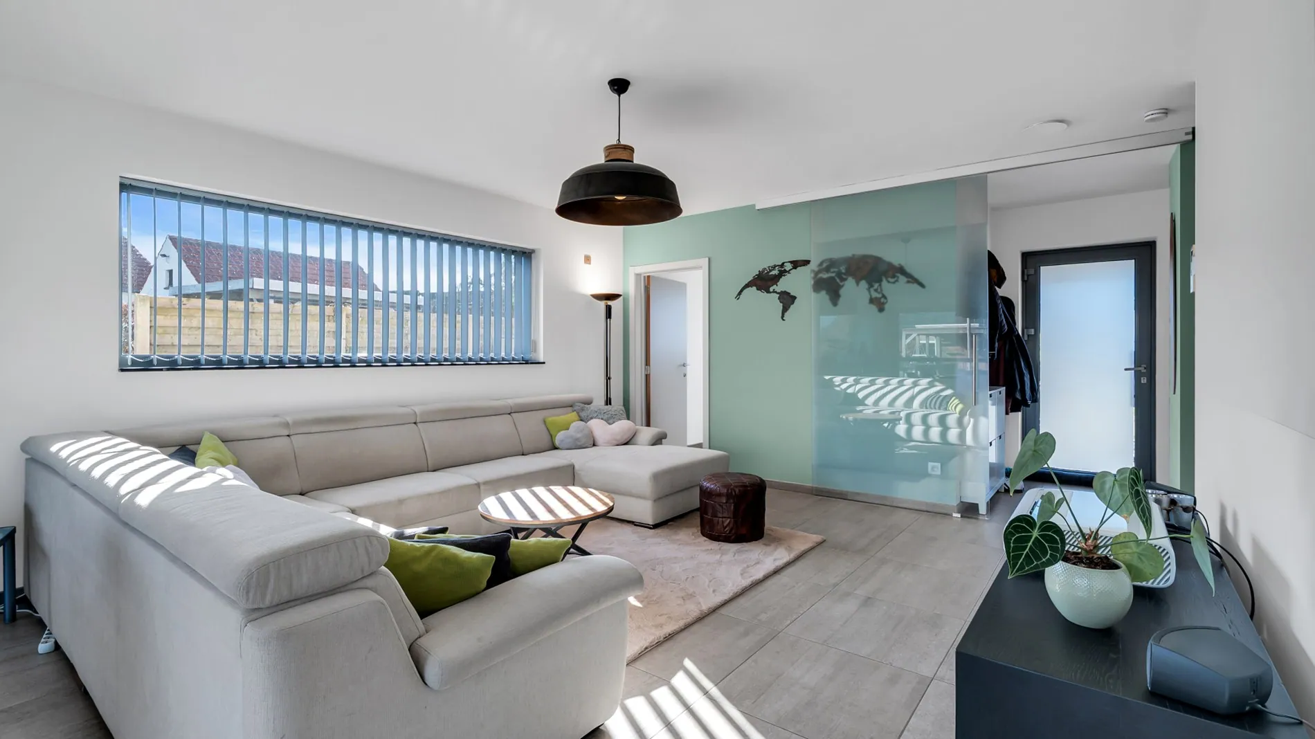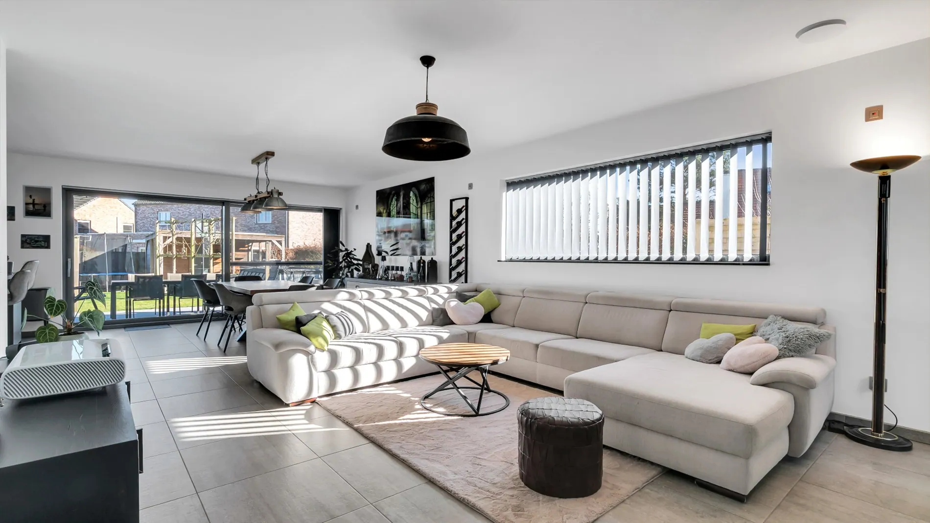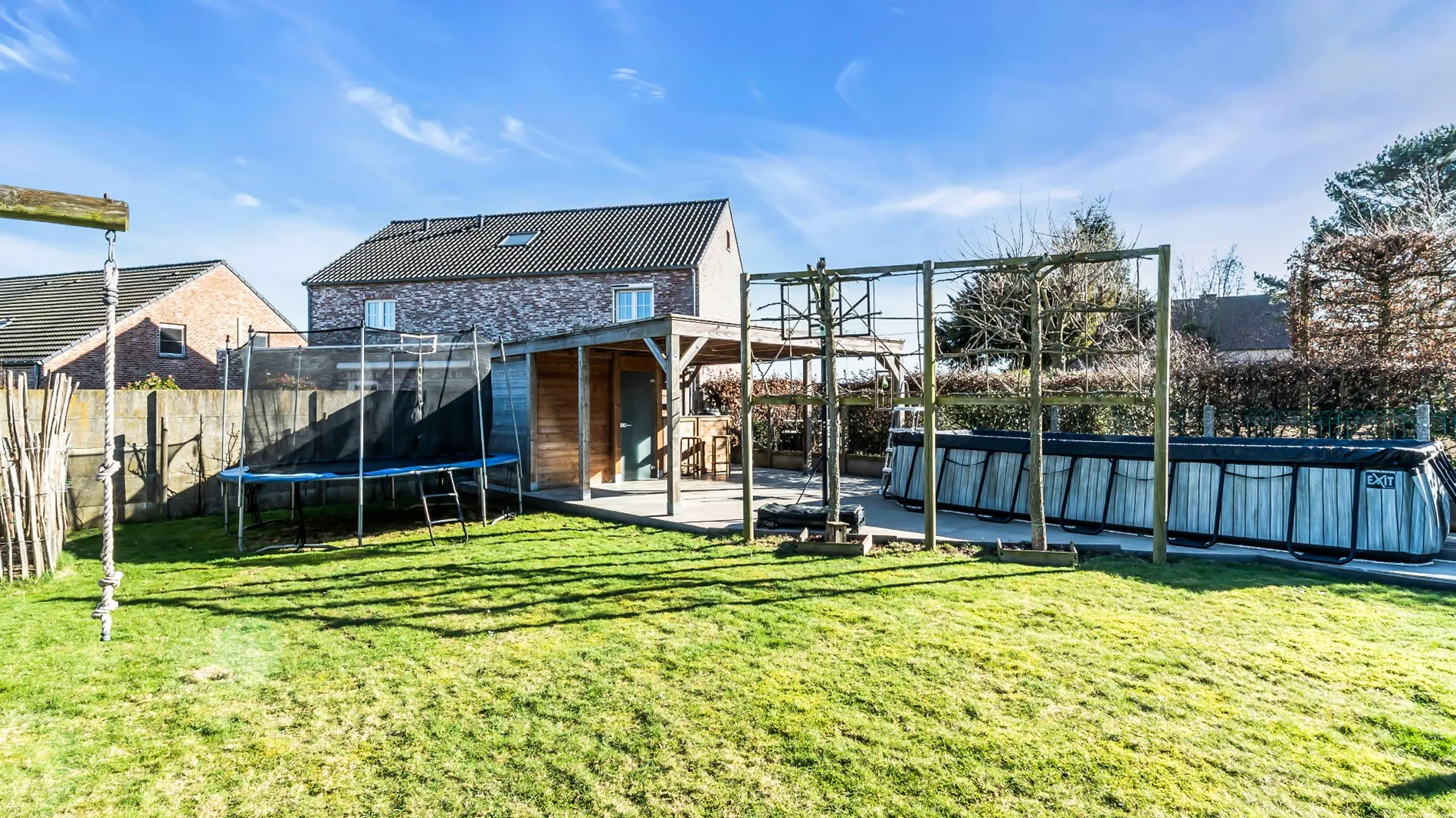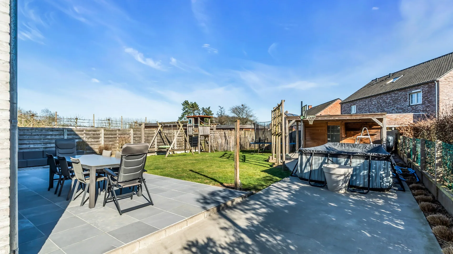 Indeling : je komt binnen in de inkomhal met gastentoilet en vestiaire. De leefruimte is volledig open, met een ruime keuken met kookeiland en berging, eetplaats , living en nog een aparte buro. De schuiframen geven toegang tot een groot terras en een zuidoost gerichte tuin. In de tuin staan 2 tuinhuizen én een opbouwzwembad.